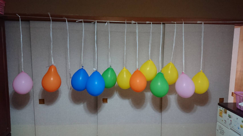 そんな時、奥さんが風船をぶら下げて遊び道具をつくってくれました!